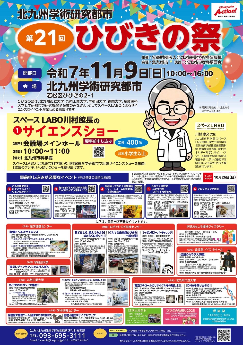 学研都市にある北九州市立大学、九州工業大工、早稲田大学と近隣の産業医科大学、学研都市の企業ならではのサイエンスなイベントも開催します。