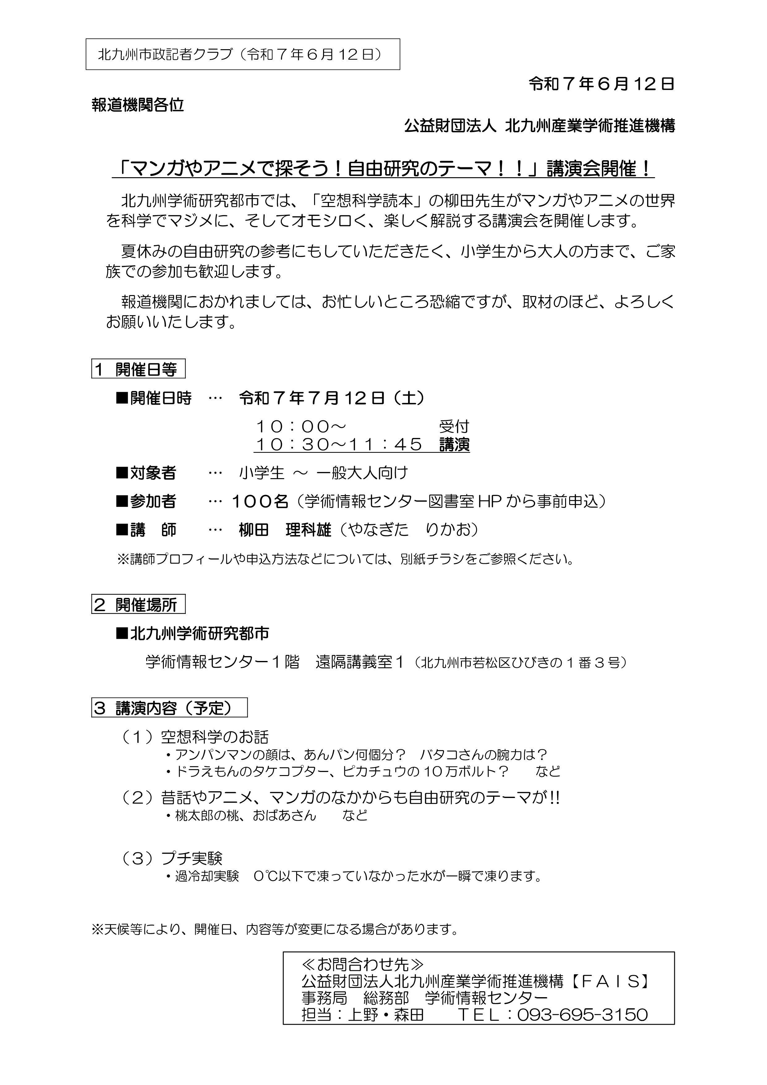 「マンガやアニメで探そう!自由研究のテーマ!!」講演会開催!