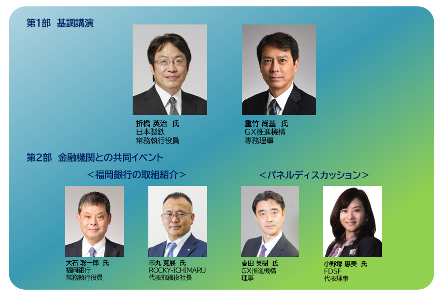 プログラム第1部の基調講演には、日本製鉄株式会社より折橋英治常務執行役員(グリーン・トランスフォーメーション推進本部長)とGX推進機構より重竹尚基COO(専務理事)のお2人をお招きし、折橋様には日本製鉄のGXの取り組みについて、重竹様には国内外のGX政策と動向についてご講演いただきます。
