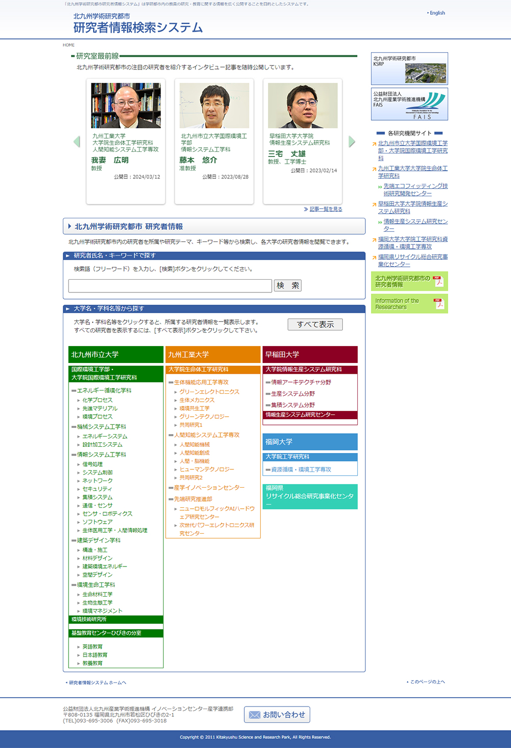 北九州学術研究都市で教育・研究活動を行っている約200名の研究者の情報をウェブサイトとリーフレットで紹介しています。