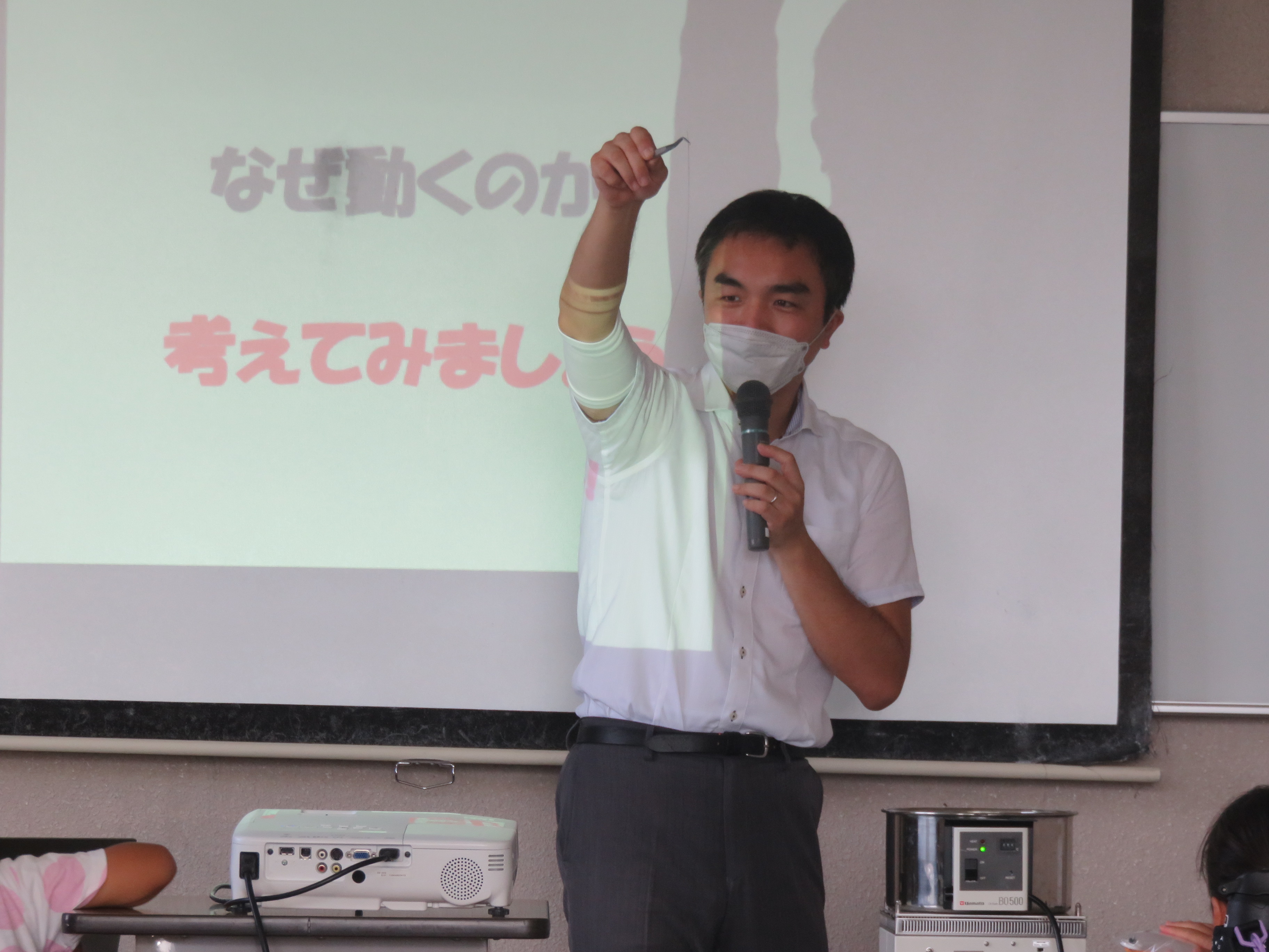7/31(月)には千代市民センターにて、機械システム工学科 長准教授による「不思議な金属・形状記憶合金を触ろう」の講義・体験を実施しました。