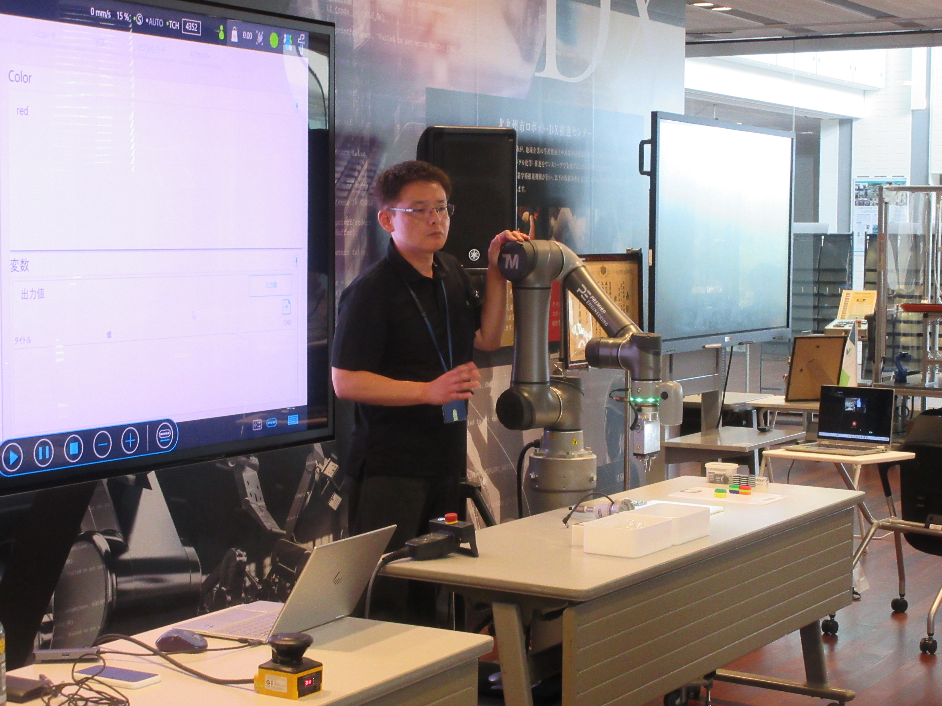 今回、プレミアエンジニアリング株式会社の松本代表取締役より、産業ロボットと協働ロボットの違いや少量多品種の自動化等についてお話しいただきました。さらに、カメラ付き協働ロボットの利点をお話しいただきながら、実際のロボットのデモや操作体験を実施いたしました。
