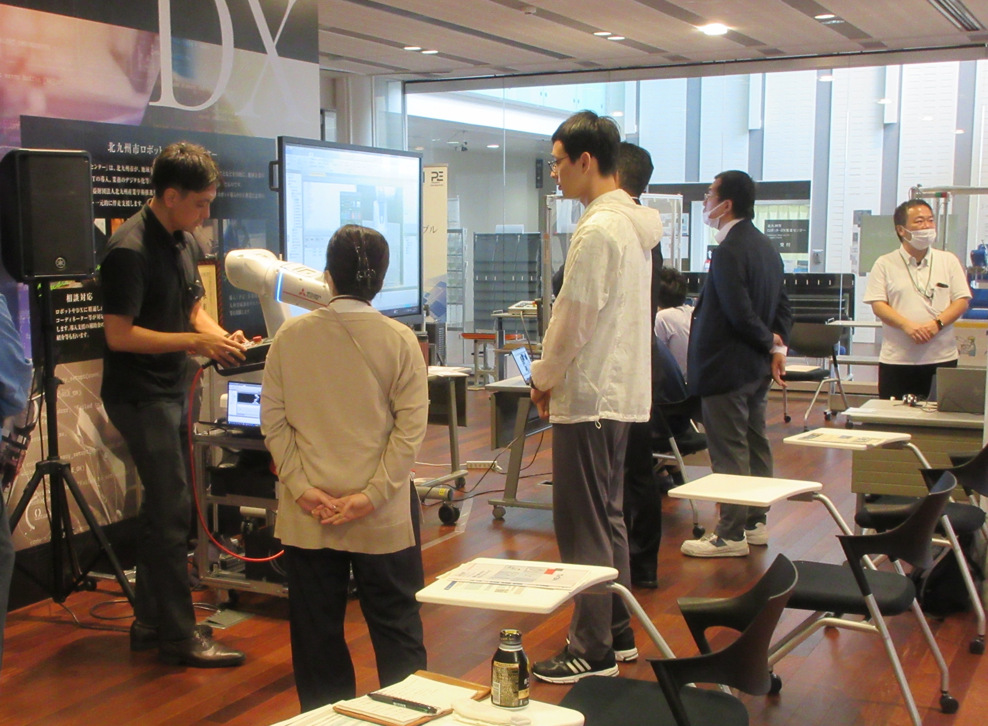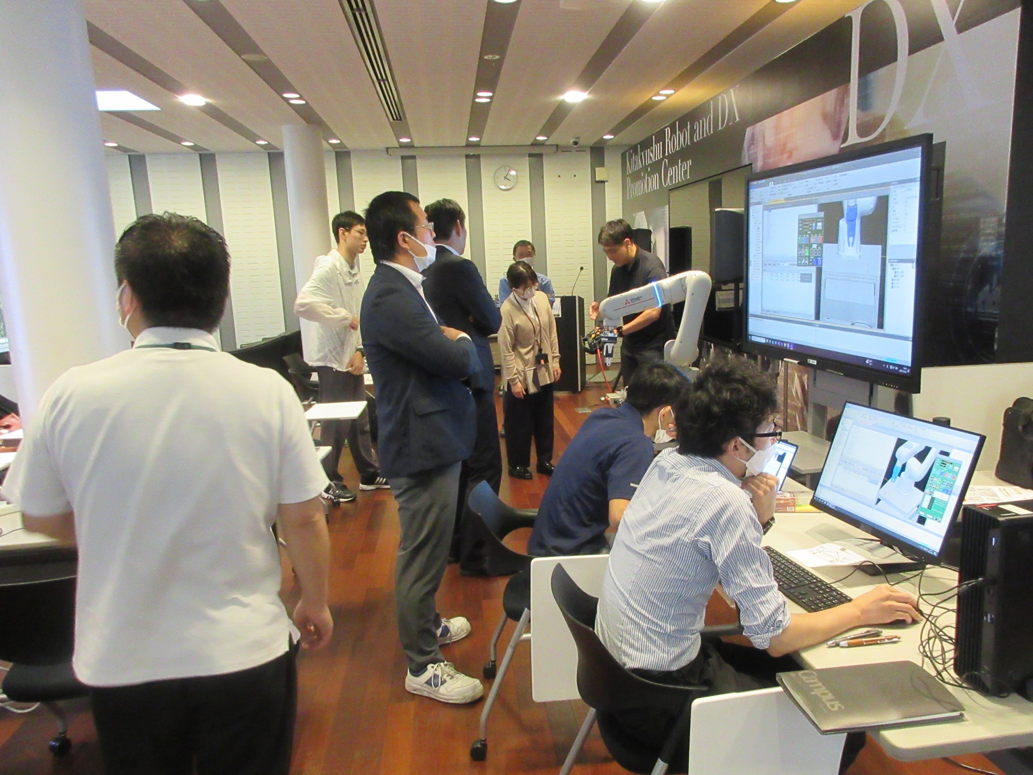 今回、三菱電機株式会社の武原氏、川崎氏、塩塚氏よりロボットのトレンドや概況紹介、ロボットを活用した生産現場の事例紹介をしていただきました。また、実機のロボットの操作体験や実際にシミュレーションソフトが入ったPCを実際に触れて体験できるコーナーの時間をつくっていただきました。