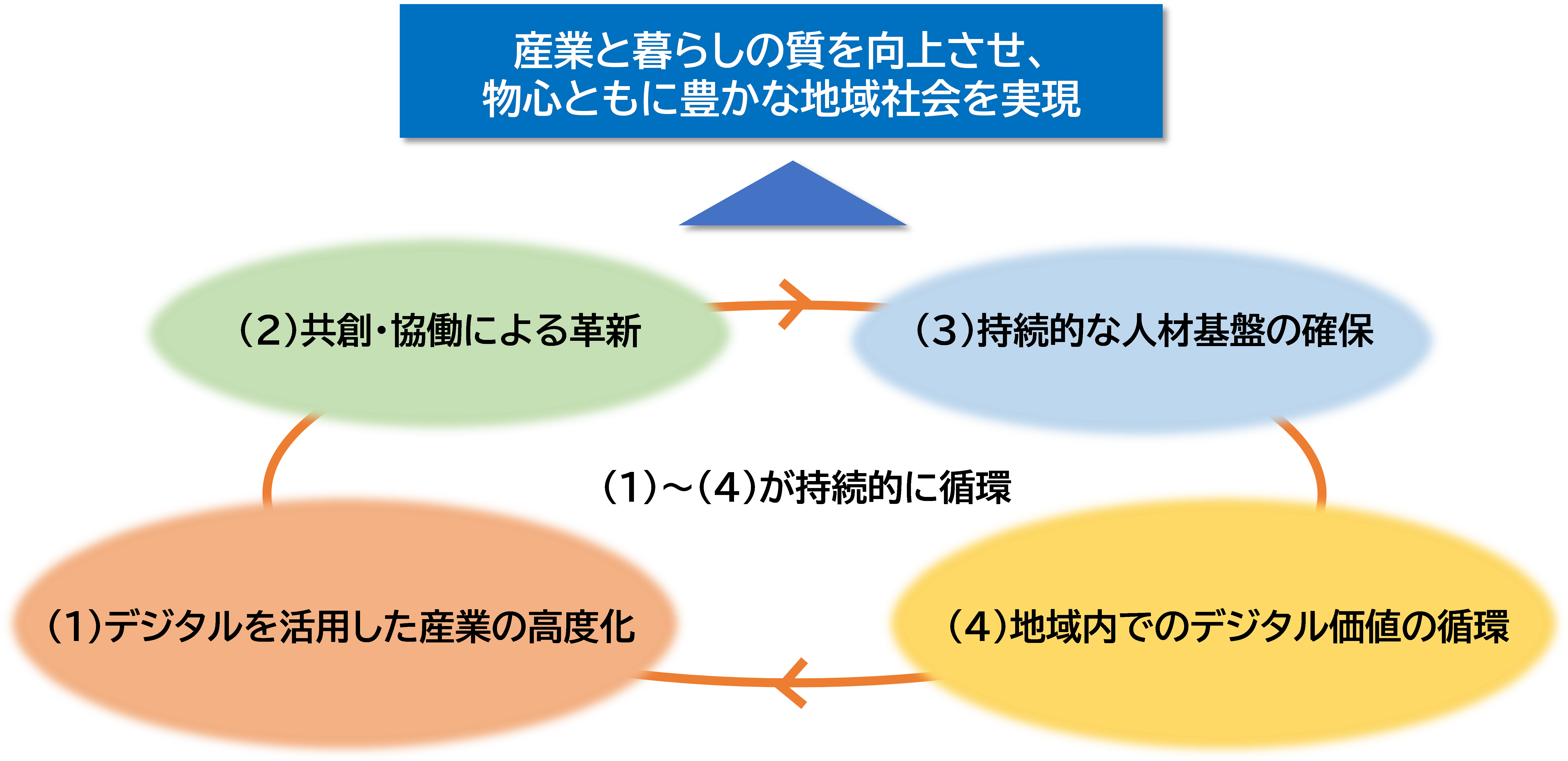 本レポートでは、地域DXの目指す姿を「産業と暮らしの質を向上させ、物心ともに豊かな地域社会を実現する」と定義しています。